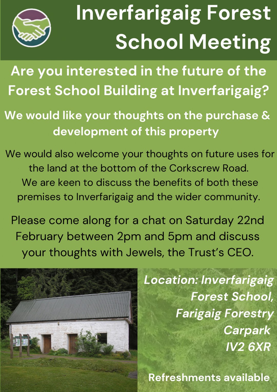Please come along to our coffee and chat session at Inverfarigaig Forest School to share your thoughts on options for further development within the Inverfarigaig area, including the possible purchase of the Forest School building.
