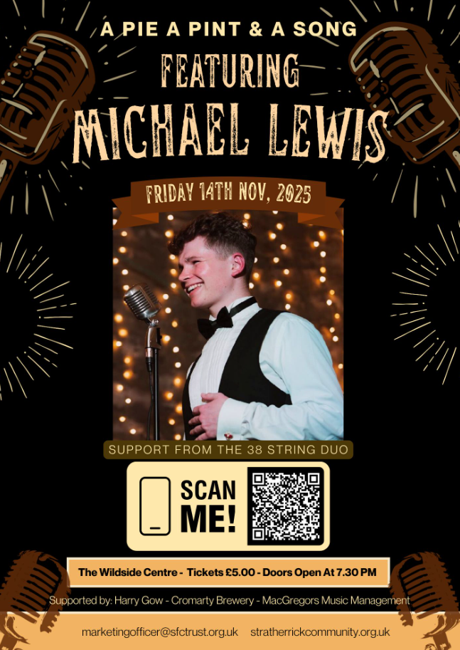 We are pleased to let you know that we have another of our 'A Pie, a Pint...' nights coming up! This time it's A Pie, A Pint, and A Song - an evening with Michael Lewis, on Friday 14th November, at The Wildside Centre. Tickets are £5 and can be purchased by scanning the QR code on the poster below.